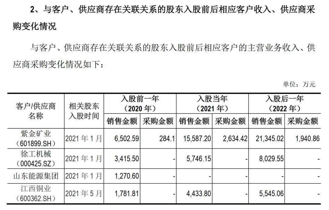 这些客户一边投资,一边也加大了采购。比如紫金矿业,2020年-2022年,海安橡胶对紫金矿业的销售金额从6502.59万元增长到2.13亿元;江西铜业也从1781.81万上涨到了5545.06万元。