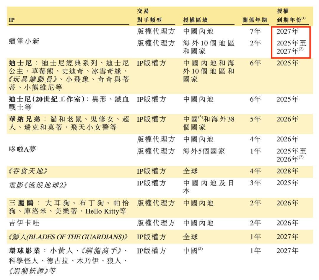 乐自天成披露蜡笔小新在中国内地的授权到期年份是2027年,而海外10个地区和国家的授权到期分别是2025年至2027年。未来若无法续签,业绩可能受到较大影响。