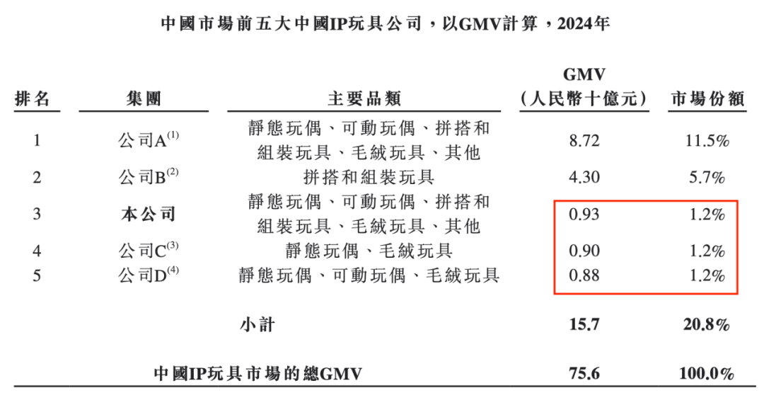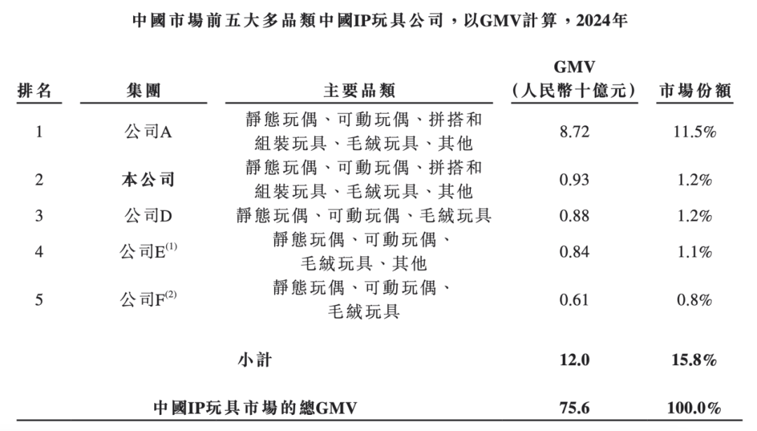 乐自天成的招股书披露,2024年公司GMV为9.3亿元,市场份额1.2%,这一数据让他们在中国市场前五大中国IP玩具公司中,排名第三;在中国市场前五大多品类中国IP玩具公司中,排名第二;在中国市场前十大IP玩具公司中,排名第七。