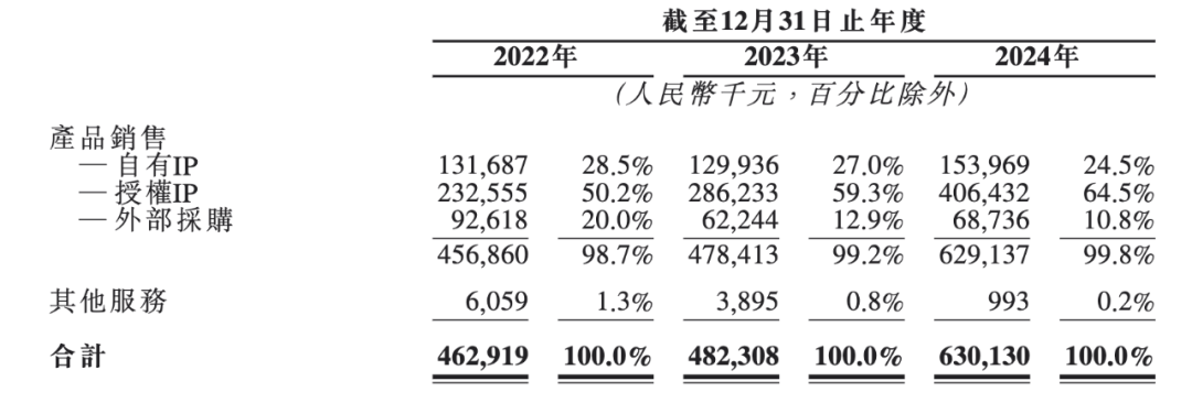 授权IP贡献的营收分别约为2.33亿元、2.86亿元和4.06亿元,占比分别为50.2%、59.3%和64.5%。可见,授权IP的营收占比呈现增长趋势,且在2024年贡献了超过6成以上的营收。