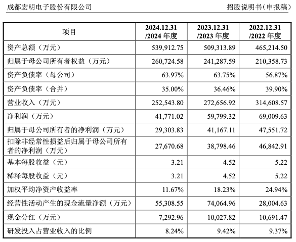 记者留意到,宏明电子在IPO前已进行了多次分红。2022年度至202年度,分别实施现金分红1.07亿元、1亿元和0.73亿元,累计分红金额达2.8亿元,占同期归母净利润的比例约为24%。