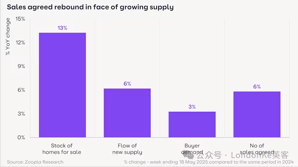 与此同时,5月达成的房屋销售量是4年来最高的,比去年同期增长了6%。与之相对应的是,更多的英国卖家正在挂牌出售房屋,比去年增加了13%。