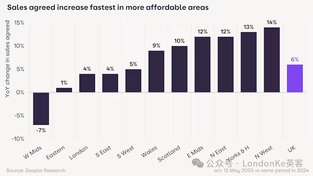 从地区差异上看,英格兰北部等房价友好地区的销售数量增长最强,房价年增长率为3%。而英格兰南部等富裕地区待售房屋增长迅速,但房价年增长率不到1%。