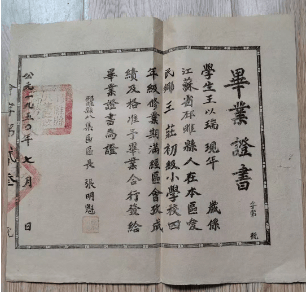 午休醒来,欲览天下大事。忽然屏幕上飘来王超的微信,忙划转急看:原来是以瑞哥的五十年代在王庄小学和占城小学时的初、高级毕业证书。制作公整,字迹端庄。王超与我虽系一村,却属两个自然村,故对以瑞哥不甚了了。既是同村,自然要关心打听一下,便微信询问起我来了。