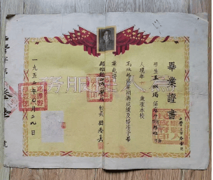 可贵的是毕业证上方中部,八面红旗簇拥着毛主席的画像