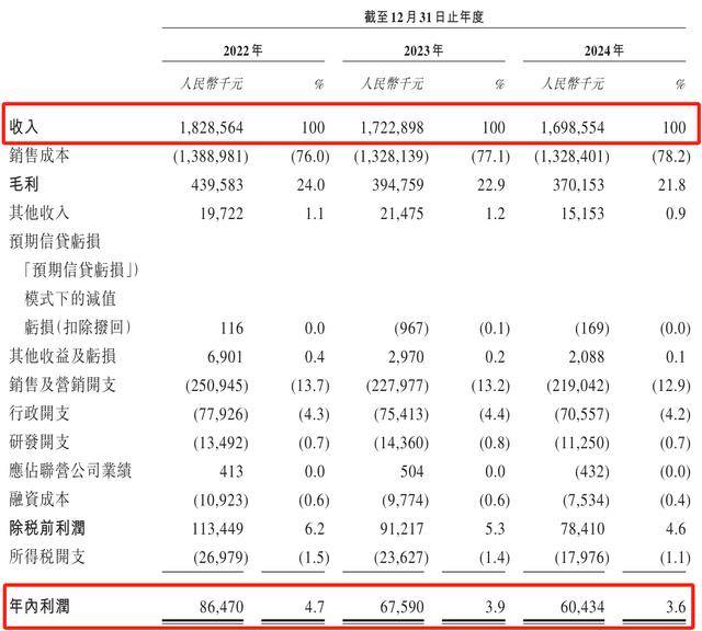 业绩方面,2022年至2024年(下称“报告期内”),凯诘电商营业收入和净利润连续两年下降。报告期内,公司商品交易总额分别为81.78亿元、100.02亿元及134.59亿元。同期,公司营业收入分别为18.29亿元、17.23亿元、16.99亿元,连续两年下滑,累计降幅达7.1%;同期净利润从8650万元降至6040万元,降幅达30.2%。
