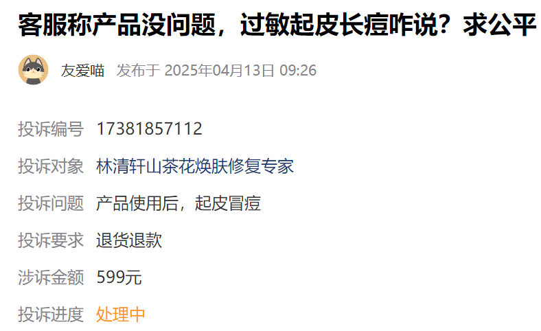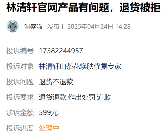 此外,在黑猫投诉平台上,涉及林清轩的投诉有100多条,主要包括“退货不退款”“产品使用后,起皮冒痘”等问题。