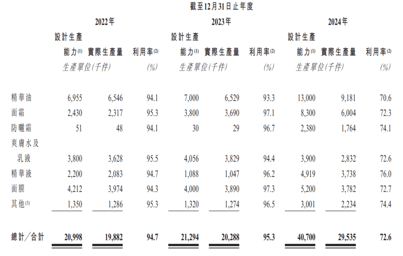 另外值得一提的是,林清轩各产品线设计产能2024年基本上都大幅提升,但相应地,产能利用率也随之大幅下降,比如,精华油产能利用率由2023年的93.3%下降至70.6%。
