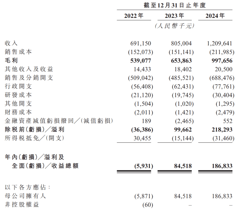 财务数据方面,报告期内(2022年至2024年),林清轩营收分别为6.91亿元、8.05亿元、12.1亿元。净利润在2022年亏损593.1万元后开始盈利,2023年和2024年分别盈利8451.8万元和1.87亿元。