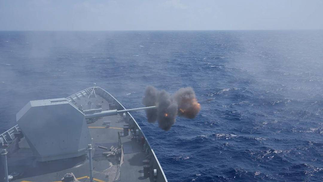 训练中,编队还围绕对岸射击展开专攻精练。面对“敌”方岸基残存火力点,渭南舰通过舰载无人机校正目标坐标,并将目标属性推送至编队。编队各舰主炮交替实施打击,形成密集火力覆盖,成功命中目标。