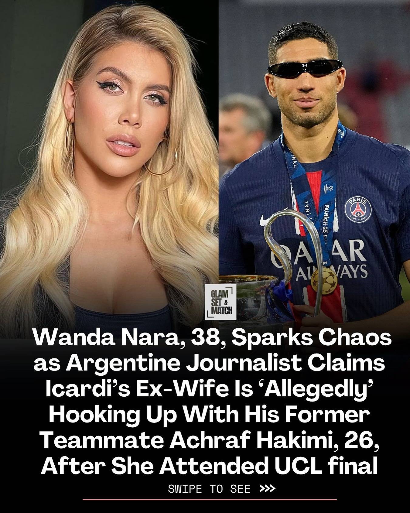 直播吧06月02日讯 据粉丝超过300万的阿根廷八卦记者Yani Latorre透露,旺达近期勾搭上了巴黎边后卫阿什拉夫,现场观看欧冠决赛并参加了巴黎内部的庆祝活动。