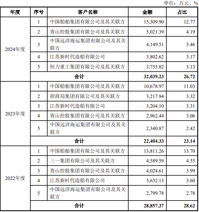公司主要客户广泛分布于船舶、钢铁、机械、铸造、汽车制造等行业。报告期内,公司客户集中度较低。2022年、2023年、2024年,公司前五大客户合计贡献的收入占公司总收入的比例分别为28.62%、23.14%、26.72%。