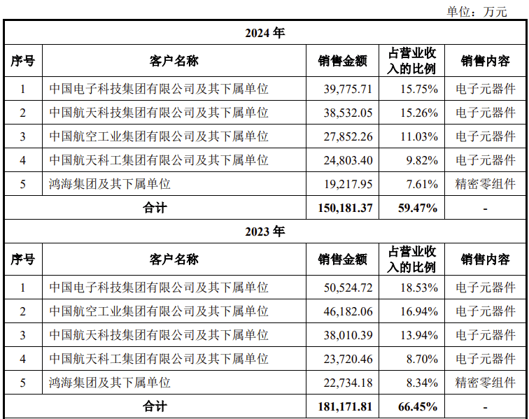 2022年、2023年、2024年,公司前五大客户合计贡献的收入占公司总收入的比例分别为63.84%、66.45%、59.47%。中国电子科技集团有限公司及其下属单位是公司第一大客户。