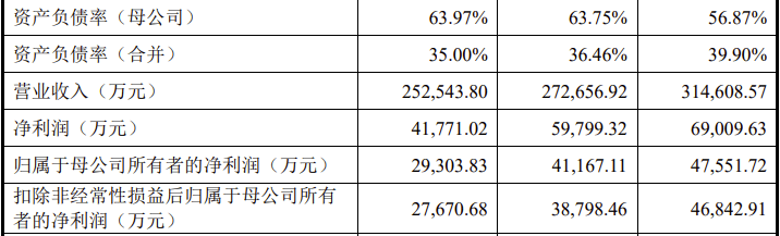 2022年至2024年,公司营业收入分别为314,608.57万元、272,656.92万元和252,543.80万元,归属于母公司股东的净利润分别为47,551.72万元、41,167.11万元和29,303.83万元。2023年度,公司营业收入和归属于母公司股东的净利润分别下降13.33%和13.43%;2024年度,公司营业收入和归属于母公司股东的净利润分别下降7.38%和28.82%。