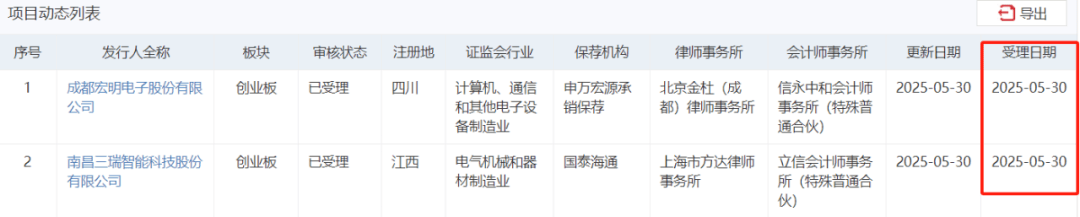 5月30日,深、沪、北三交易所共受理4家企业的IPO申请:深交所受理成都宏明电子、南昌三瑞智能科技的创业板IPO申请,上交所受理陕西旅游文化产业的主板IPO申请,北交所受理大亚股份(832532)的IPO申请。深交所这两家IPO申请也是2025年首次获得受理的创业板IPO。值得一提的是,宏明电子股东共有547名,2023年、2024年营收、扣非归母净利润同比持续下降,但2024年扣非净利润仍有2.767亿元。南昌三瑞智能2024年在全球民用无人机电动动力系统(不含动力电池)市场的市场份额为7.1%,市场份额仅次于大疆创新,排名全球第二。报告期业绩快速增长。陕西旅游文化产业股份有限公司2022年亏损,2024年扣非净利润超5亿元,选择主板上市第二套标准。