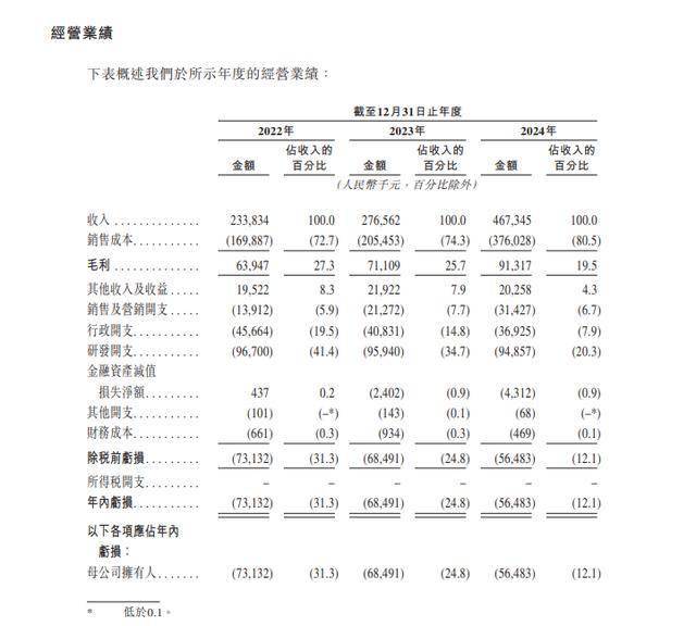 2022年-2024年,乐动机器人的研发开支分别为9670万元、9590万元及9490万元,分别占收入的41.4%、34.7%及20.3%。