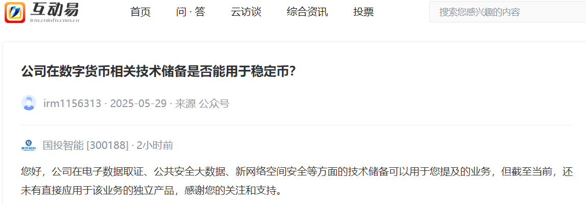国投智能也解释,公司在电子数据取证、公共安全大数据、新网络空间安全等方面的技术储备可以用于投资者提及的业务,但截至当前,还未有直接应用于该业务的独立产品。