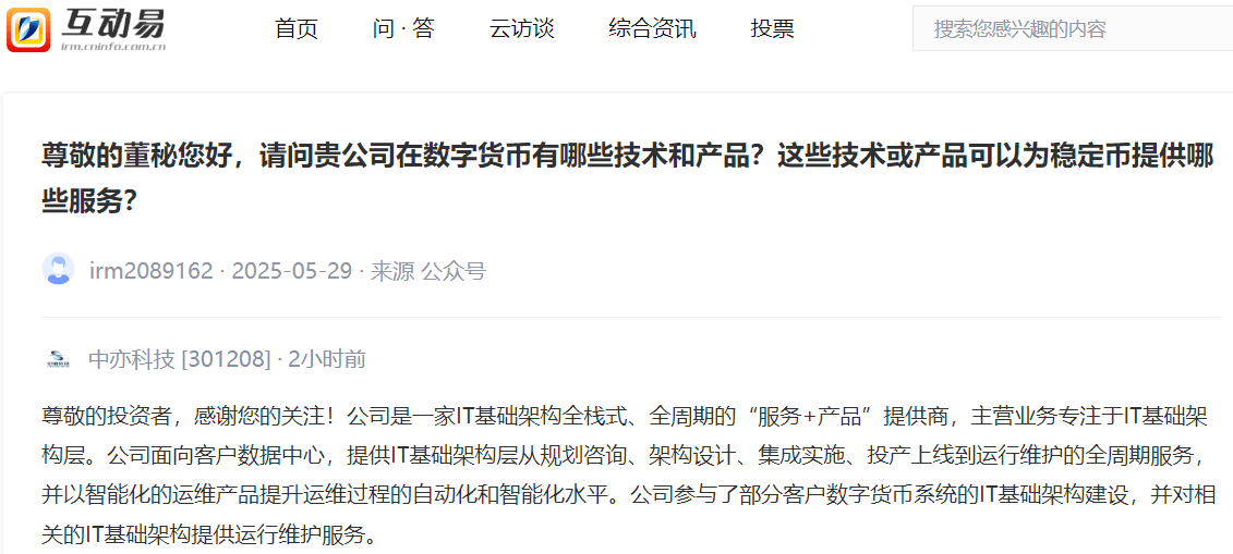 中亦科技介绍,公司是一家IT基础架构全栈式、全周期的“服务+产品”提供商,主营业务专注于IT基础架构层。公司参与了部分客户数字货币系统的IT基础架构建设,并对相关的IT基础架构提供运行维护服务。