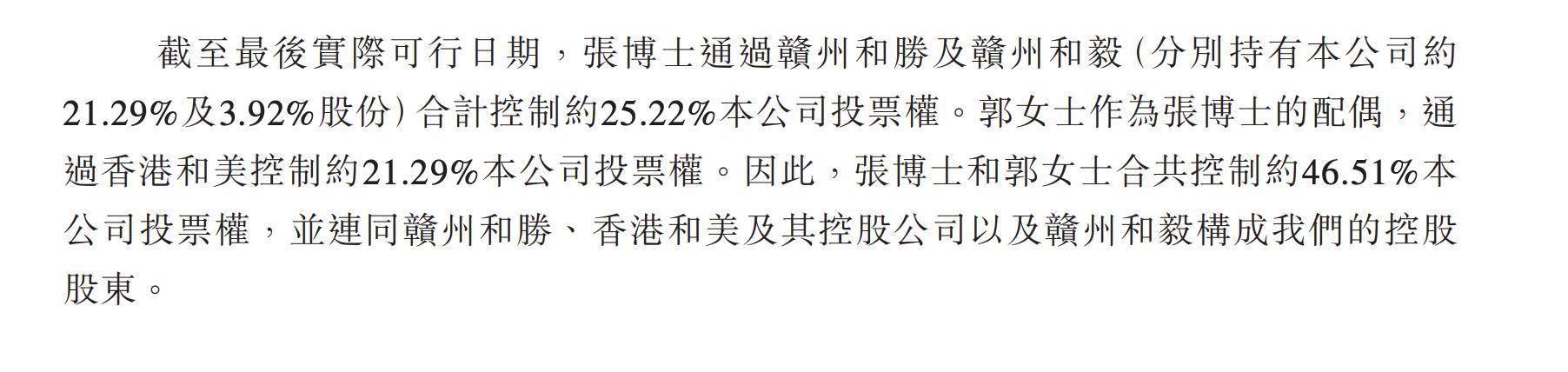 截至最后实际可行日期,张和胜通过赣州和胜及赣州和毅(分别持有和美药业约21.29%及3.92%股份)合计控制约25.22%公司投票权。郭雪梅作为张和胜的配偶,通过香港和美控制约21.29%公司投票权。因此,张和胜和郭雪梅合共控制约46.51%公司投票权,并连同赣州和胜、香港和美及其控股公司以及赣州和毅构成和美药业的控股股东。