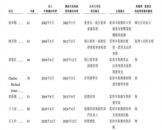 高管方面,61岁张和胜担任公司董事长、执行董事兼总经理,43岁陈英伟担任执行董事、副总经理兼董事会秘书,46岁霍爱红担任执行董事兼副总经理,70岁Charles Richard Jones担任首席医学官,51岁曾广怀担任副总经理,58岁于立新担任副总经理兼销售部门负责人,47岁石玉玲担任财务总监。
