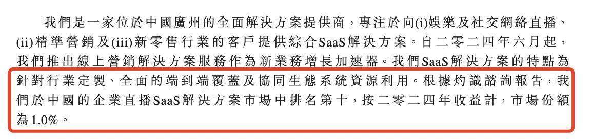 自2024年6月起,公司推出线上营销解决方案服务作为新业务增长加速器。根据灼识谘询报告,其于中国的企业直播SaaS解决方案市场中排名第十,按2024年收益计,市场份额为1.0%。