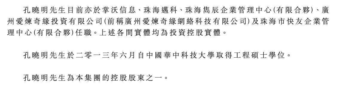 孔晓明目前亦于掌沃信息、珠海迈科、珠海隽辰企业管理中心(有限合伙)、广州爱炼奇缘投资有限公司(前称广州爱炼奇缘网络科技有限公司)及珠海市快友企业管理中心(有限合伙)任职。