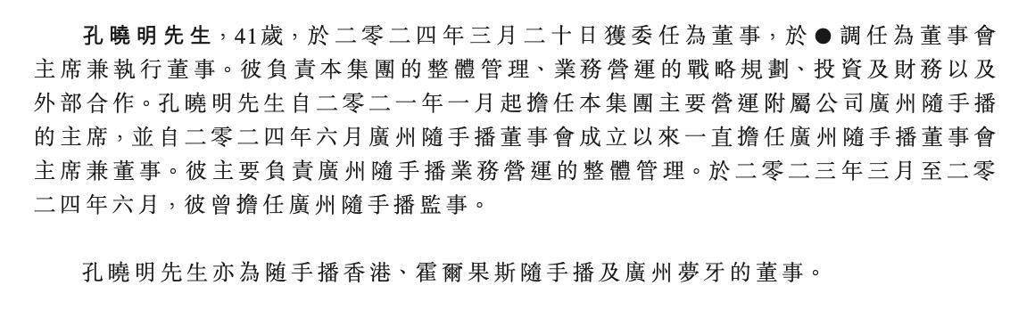 孔晓明自2021年1月起担任集团主要营运附属公司广州随手播的主席,并自2024年6月广州随手播董事会成立以来一直担任广州随手播董事会主席兼董事。其主要负责广州随手播业务营运的整体管理。于2023年3月至2024年6月,其曾担任广州随手播监事。