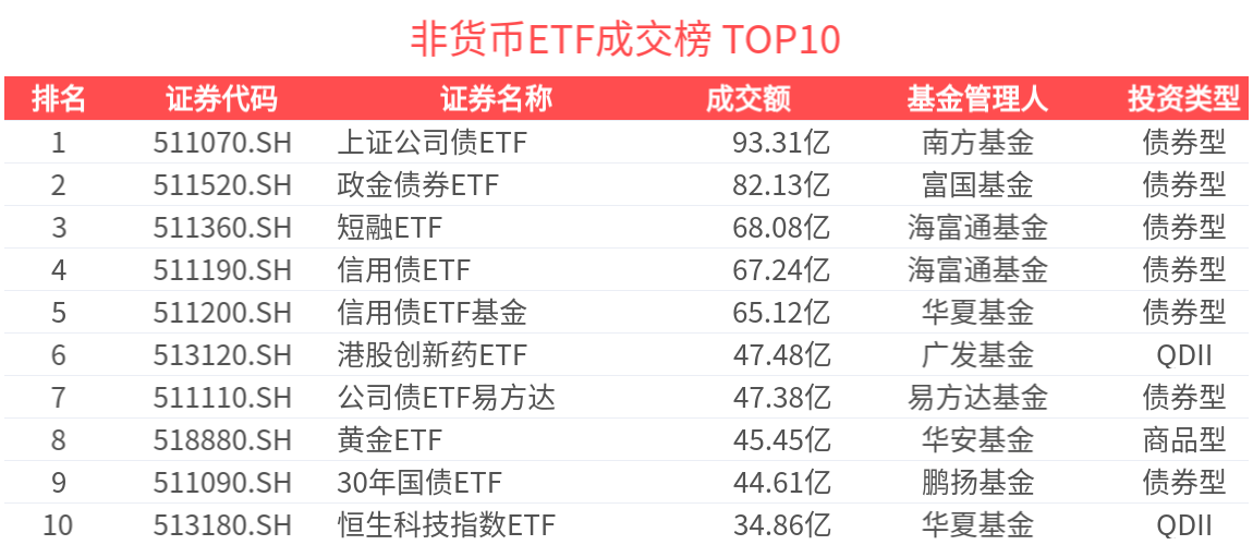 截至今日收盘,上证公司债ETF、政金债券ETF、短融ETF成交额居市场前列,分别达93.31亿、82.13亿、68.08亿。行业主题类ETF共计2只,分别是港股创新药ETF、恒生科技指数ETF。