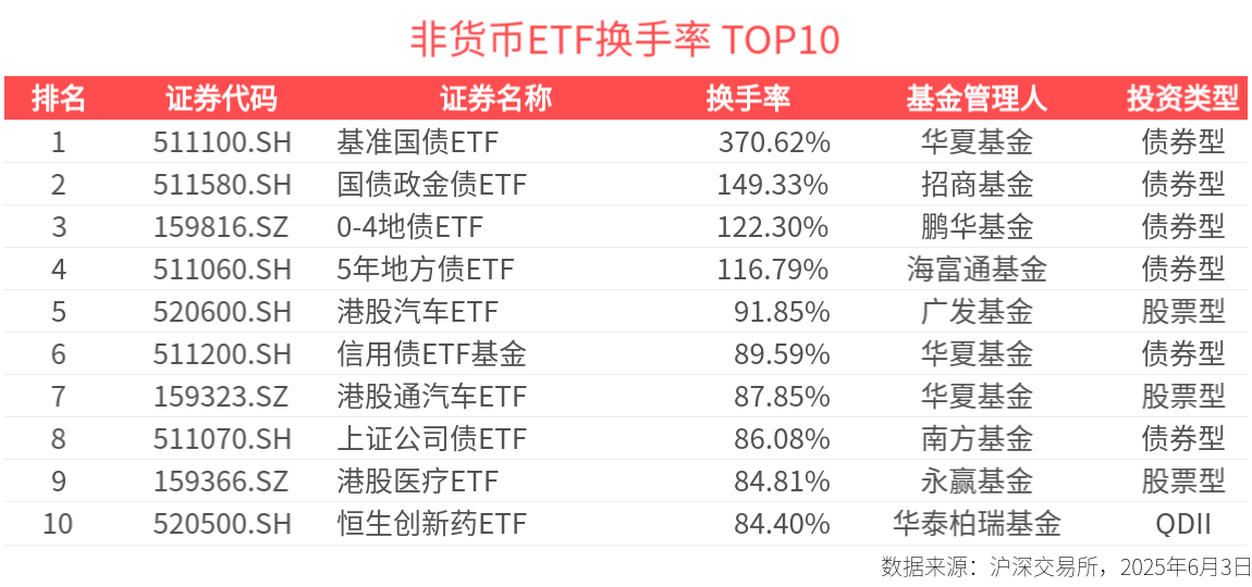 截至今日收盘,基准国债ETF、国债政金债ETF、0-4地债ETF换手率居市场前列,分别达370.62%、149.33%、122.30%。行业主题类ETF共计4只,分别是港股汽车ETF、港股通汽车ETF、港股医疗ETF、恒生创新药ETF。