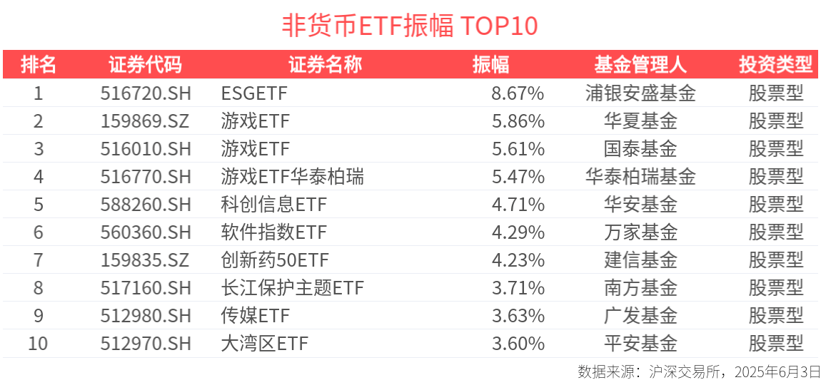 截至今日收盘,ESGETF、游戏ETF、游戏ETF振幅居市场前列,分别达8.67%、5.86%、5.61%。