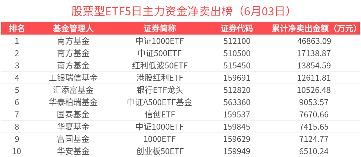 近5天主力资金累计净卖出超过1亿元的股票型ETF基金有5只,金额居前的为中证1000ETF(512100), 中证500ETF(510500), 红利低波50ETF(515450), 港股红利ETF(159691), 银行ETF龙头(512820)分别净卖出4.69亿元, 1.71亿元, 1.39亿元, 1.26亿元, 1.05亿元。其中,中证1000ETF近5天遭主力资金大幅净卖出。