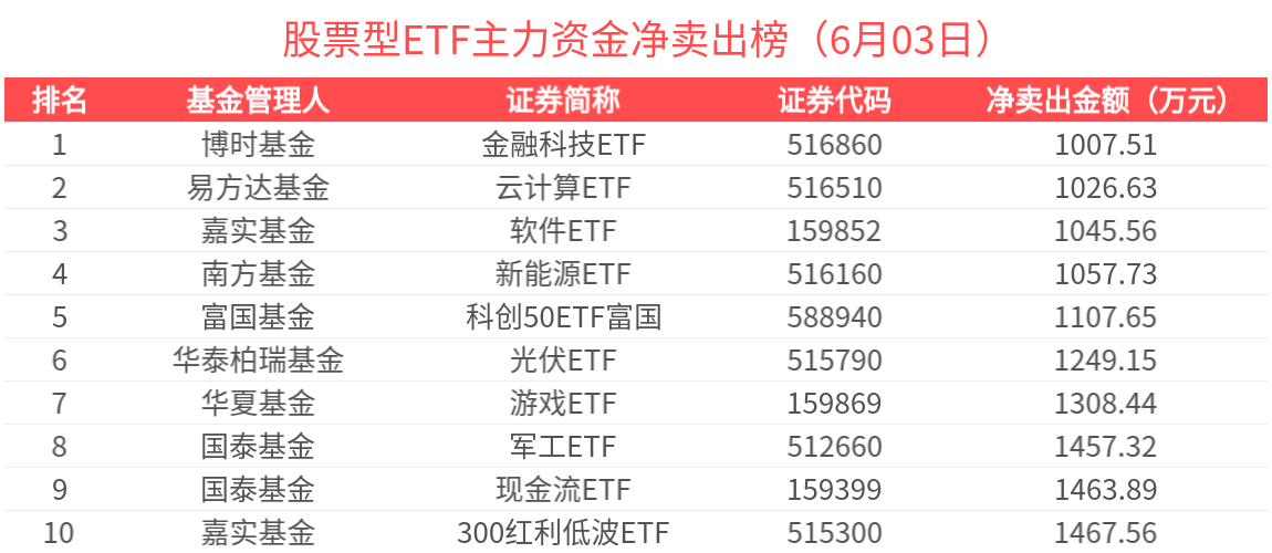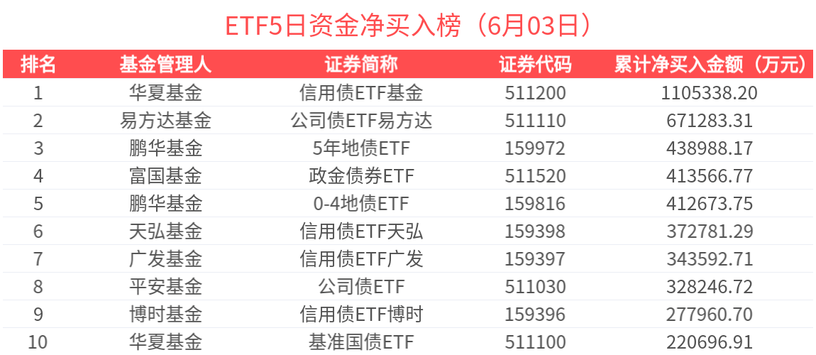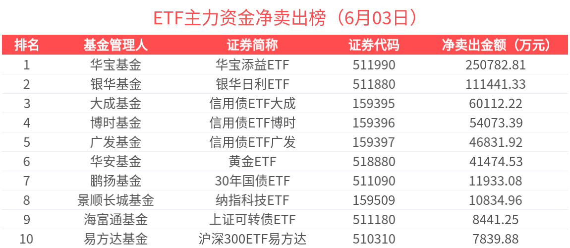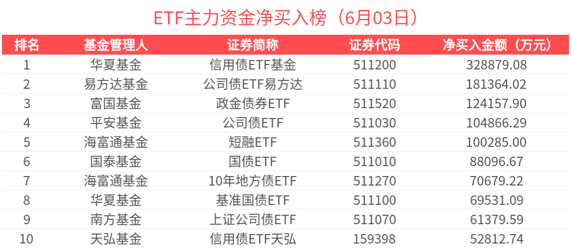 2025年6月3日,共305只ETF基金获主力资金(单笔成交额100万元以上)净买入,181只ETF基金遭主力资金净卖出。主力资金净买入金额超1千万元的ETF基金有123只,信用债ETF基金(511200), 公司债ETF易方达(511110), 政金债券ETF(511520), 公司债ETF(511030), 短融ETF(511360)受到主力资金青睐,分别获净买入32.89亿元, 18.14亿元, 12.42亿元, 10.49亿元, 10.03亿元。