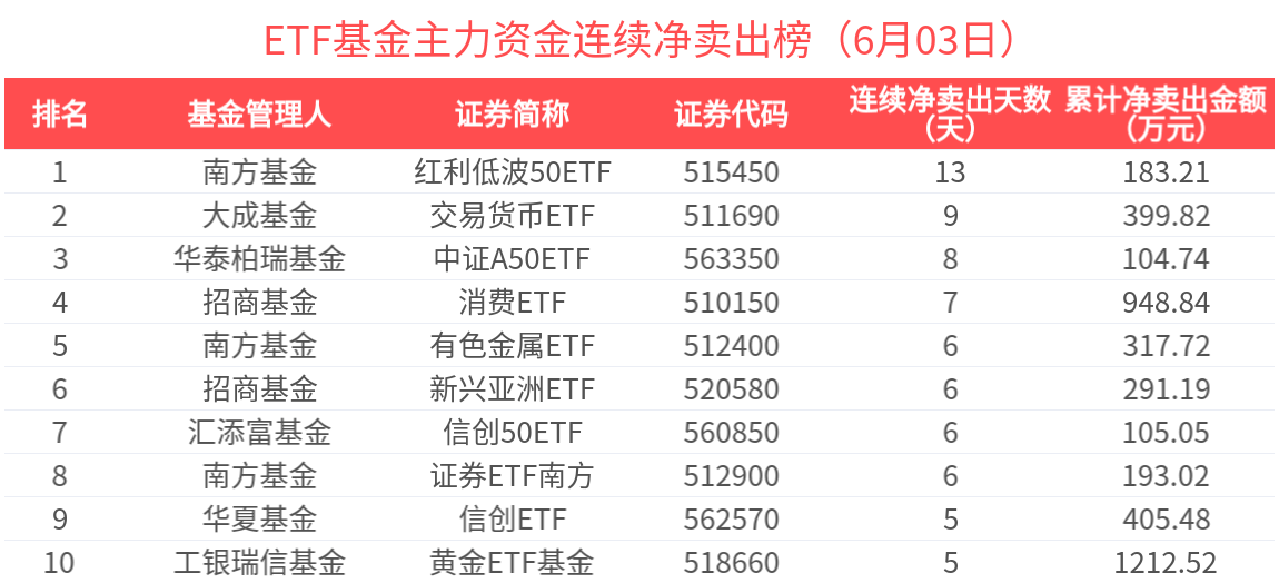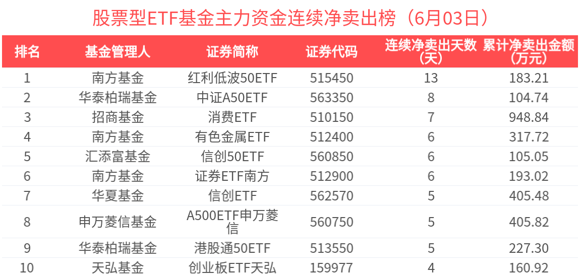 近期主力资金连续净卖出的股票型ETF基金有66只,居前的为红利低波50ETF(13天), 中证A50ETF(8天), 消费ETF(7天), 有色金属ETF(6天), 信创50ETF(6天)分别净卖出3.46亿元, 1043.31万元, 3302.34万元, 5361.01万元, 1188.54万元。其中,沪深300ETF易方达近2天遭主力资金加速卖出,近2天累计卖出1.45亿元。