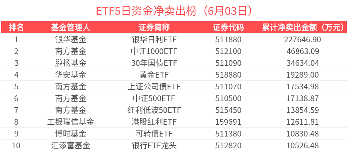 近5天主力资金累计净卖出超过1亿元的ETF基金有10只,金额居前的为银华日利ETF(511880), 中证1000ETF(512100), 30年国债ETF(511090), 黄金ETF(518880), 上证公司债ETF(511070)分别净卖出22.76亿元, 4.69亿元, 3.46亿元, 1.93亿元, 1.75亿元。其中,银华日利ETF近5天遭主力资金大幅净卖出。