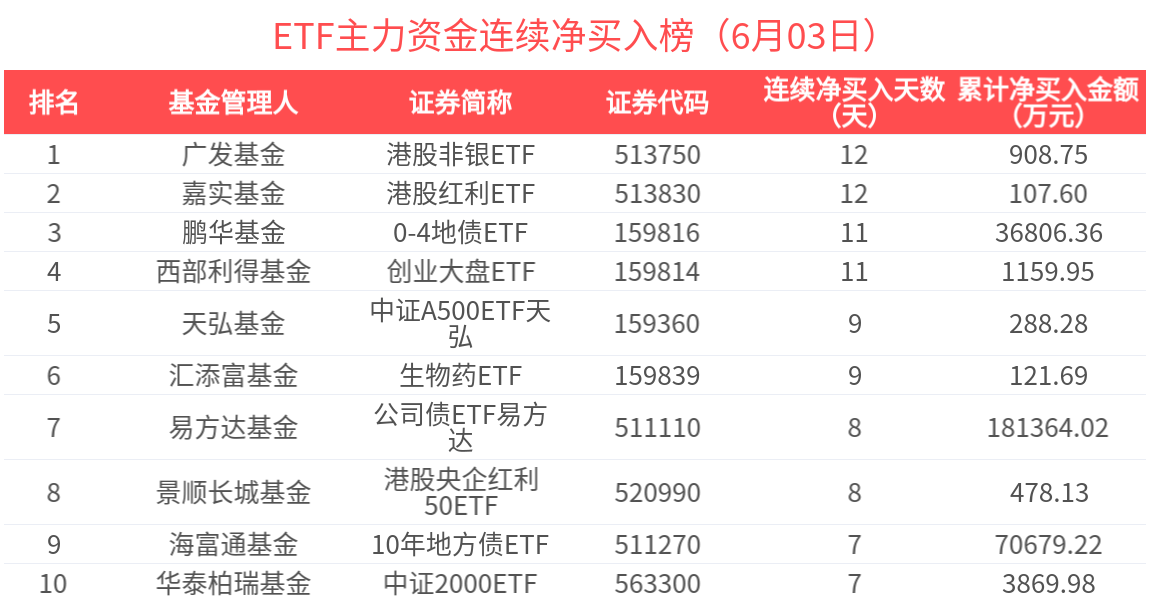 近期主力资金连续净买入的ETF基金有126只,居前的为港股非银ETF(12天), 港股红利ETF(12天), 0-4地债ETF(11天), 创业大盘ETF(11天), 中证A500ETF天弘(9天)分别净买入8334.04万元, 5774.66万元, 118.07亿元, 8596.92万元, 4996.60万元。其中,信用债ETF基金近6天获主力资金加速买入,近6天累计买入141.49亿元。