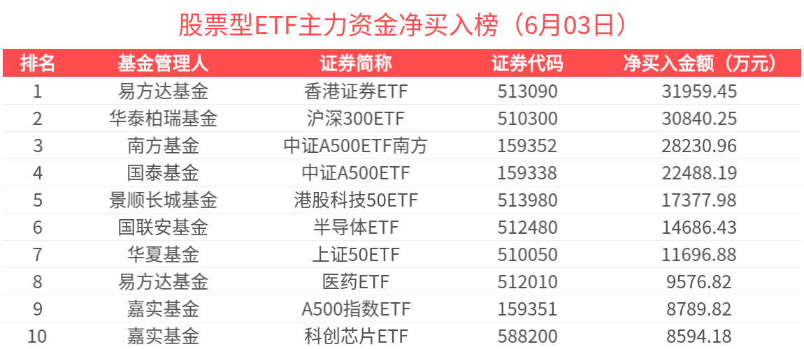 其中,主力资金净买入金额超1千万元的股票型ETF基金有78只,香港证券ETF(513090), 沪深300ETF(510300), 中证A500ETF南方(159352), 中证A500ETF(159338), 港股科技50ETF(513980)受到主力资金青睐,分别获净买入3.20亿元, 3.08亿元, 2.82亿元, 2.25亿元, 1.74亿元。