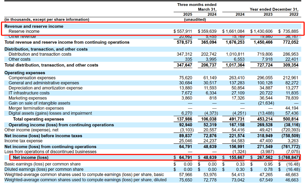 公司主要投资于美国国债(85%由贝莱德的CircleReserveFund管理)和现金(10-20%存于全球系统重要性银行)。这种模式利润丰厚,2024年产生了约16亿美元的利息收入(“储备收入”),这占Circle总收入的99%。