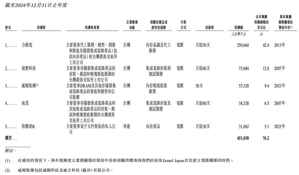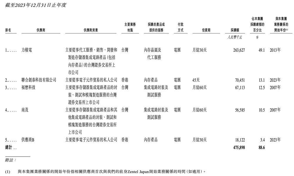 截至2024年12月31日止三个年度,力积存储向前五大供应商采购的金额分别约为6.73亿元、4.76亿元、4.51亿元,分别占同期采购总额约97.0%、88.6%、76.2%。