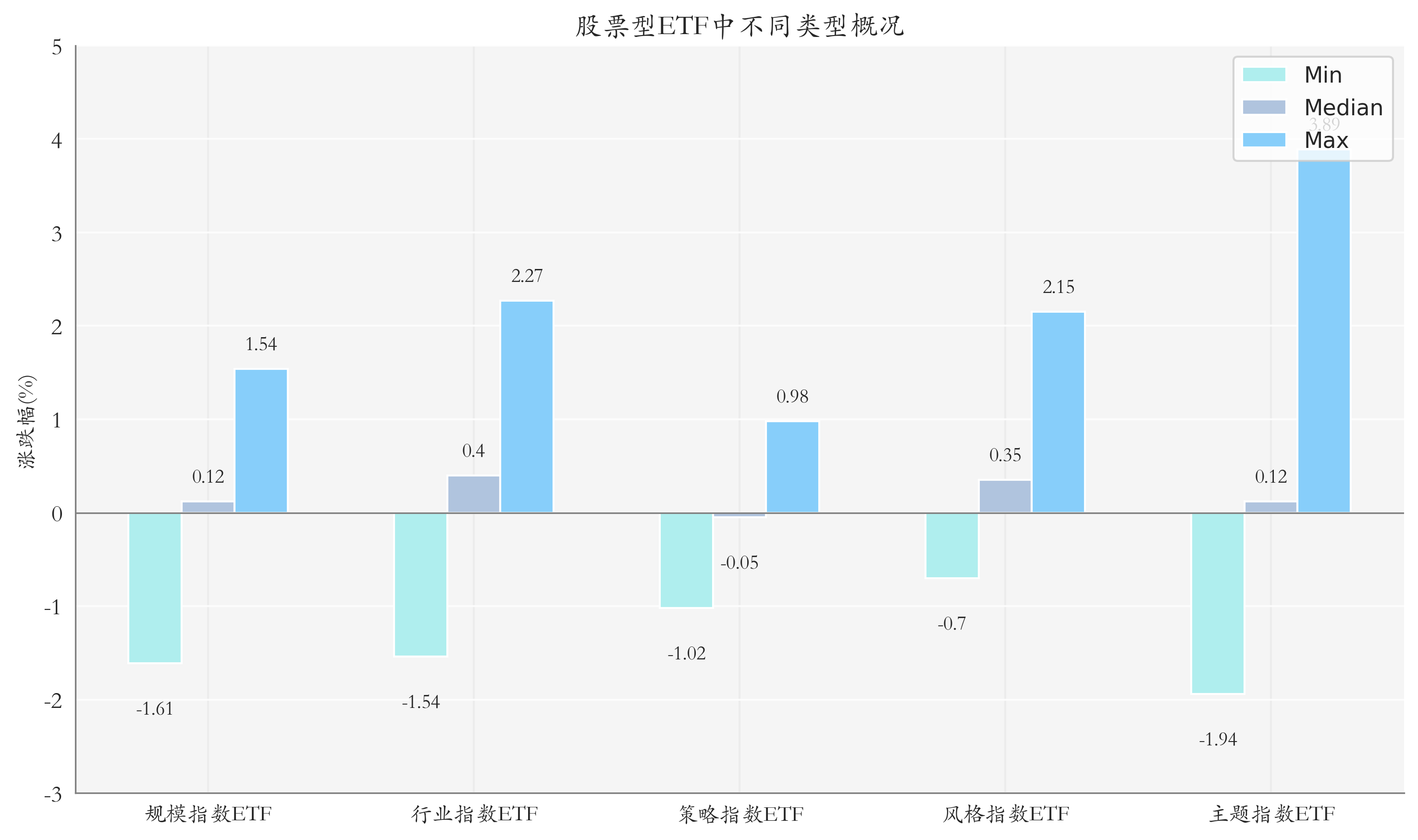 昨日股票型ETF收益率中位数为0.13%。其中按照不同分类,规模指数ETF中汇添富上证科创板100ETF收益率最高,为1.54%;行业指数ETF中国泰创业板医药卫生ETF收益率最高,为2.27%;策略指数ETF中华宝标普中国A股红利机会ETF收益率最高,为0.98%;风格指数ETF中招商中证银行AH价格优选ETF收益率最高,为2.15%;主题指数ETF中国泰中证沪深港黄金产业股票ETF收益率最高,为3.89%。