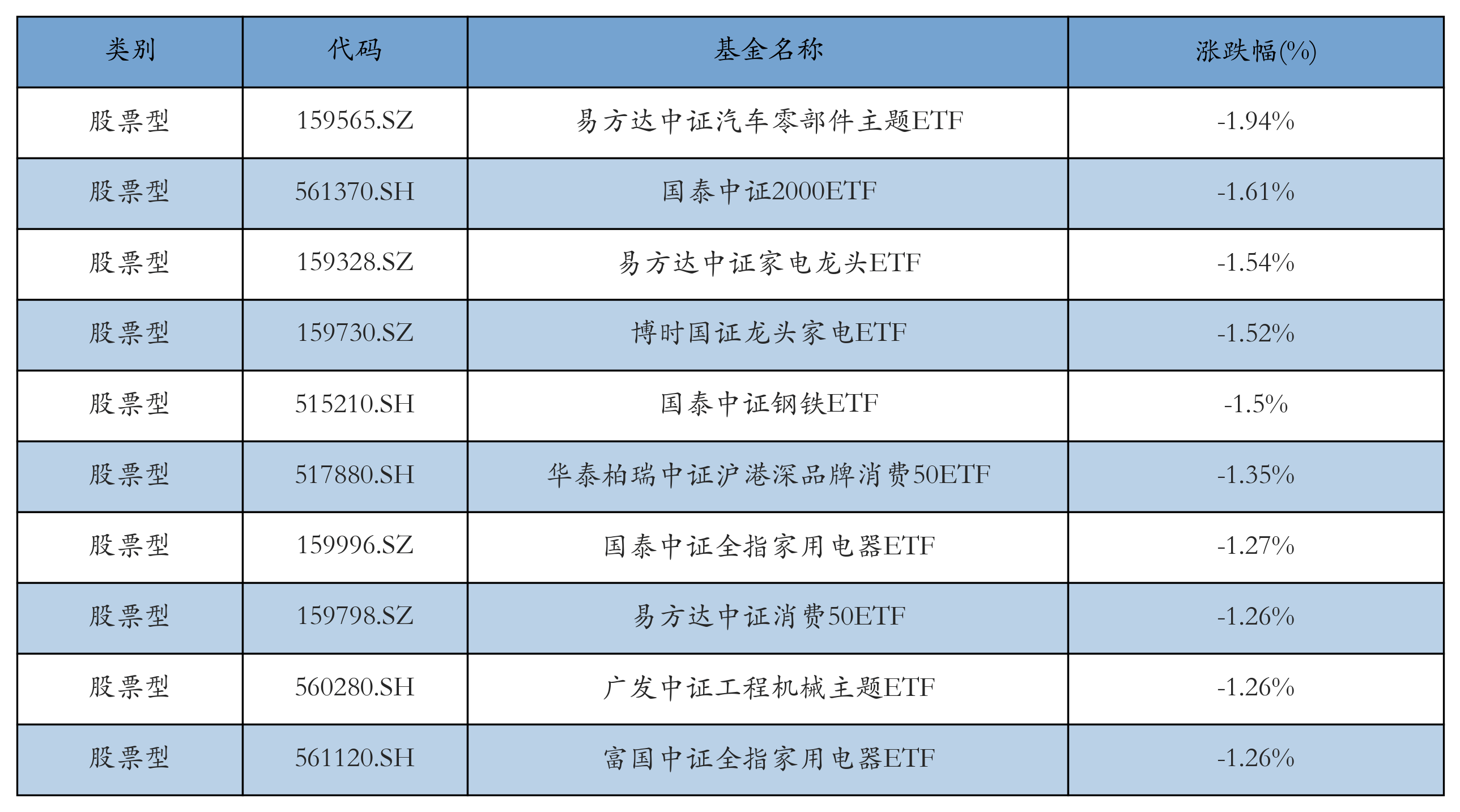 昨日股票型ETF跌幅最大的3支ETF及其收益率分别为:易方达中证汽车零部件主题ETF(-1.94%)、国泰中证2000ETF(-1.61%)、易方达中证家电龙头ETF(-1.54%)。跌幅前10详情见下表: