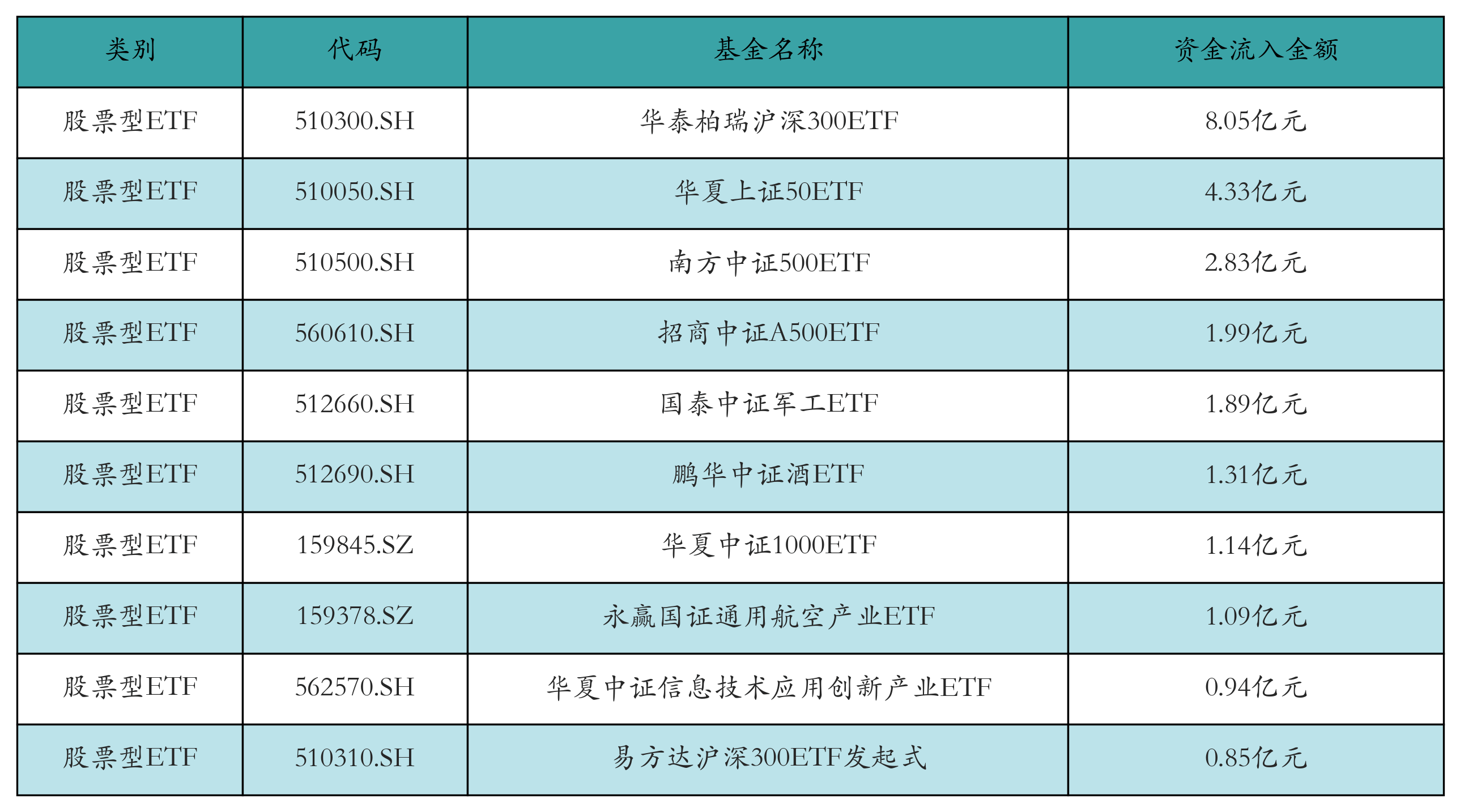 昨日股票型ETF资金流入最多的3支ETF及其流入金额分别为:华泰柏瑞沪深300ETF(流入8.05亿元)、华夏上证50ETF(流入4.33亿元)、南方中证500ETF(流入2.83亿元)。资金流入前10详情见下表: