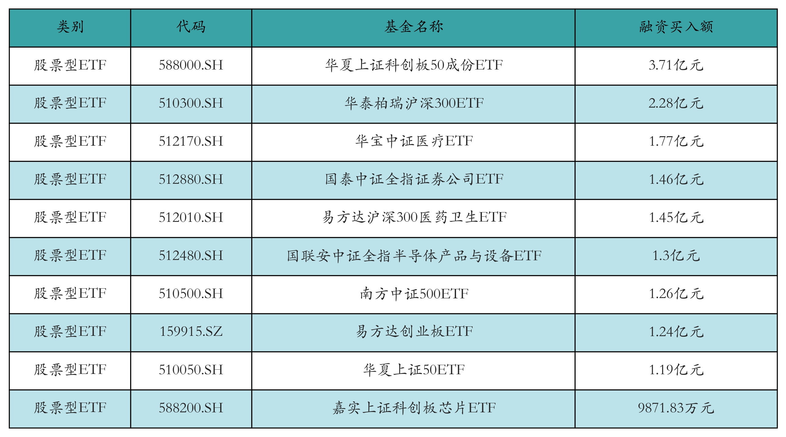 昨日股票型ETF融资买入额最高的3支ETF及其买入金额分别为:华夏上证科创板50成份ETF(3.71亿元)、华泰柏瑞沪深300ETF(2.28亿元)、华宝中证医疗ETF(1.77亿元)。融资买入额前10详情见下表: