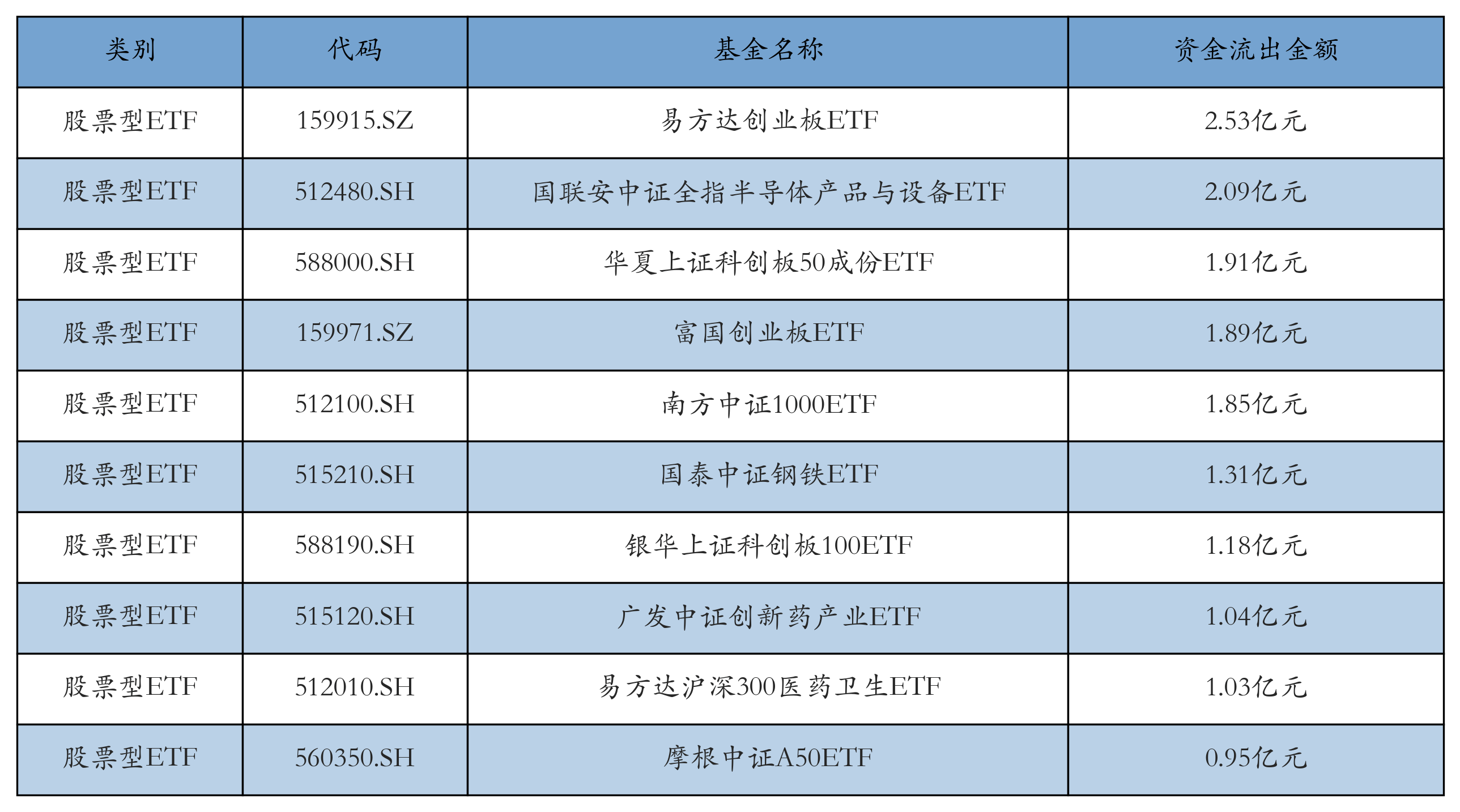 昨日股票型ETF资金流出最多的3支ETF及其流出金额分别为:易方达创业板ETF(流出2.53亿元)、国联安中证全指半导体产品与设备ETF(流出2.09亿元)、华夏上证科创板50成份ETF(流出1.91亿元)。资金流出前10详情见下表: