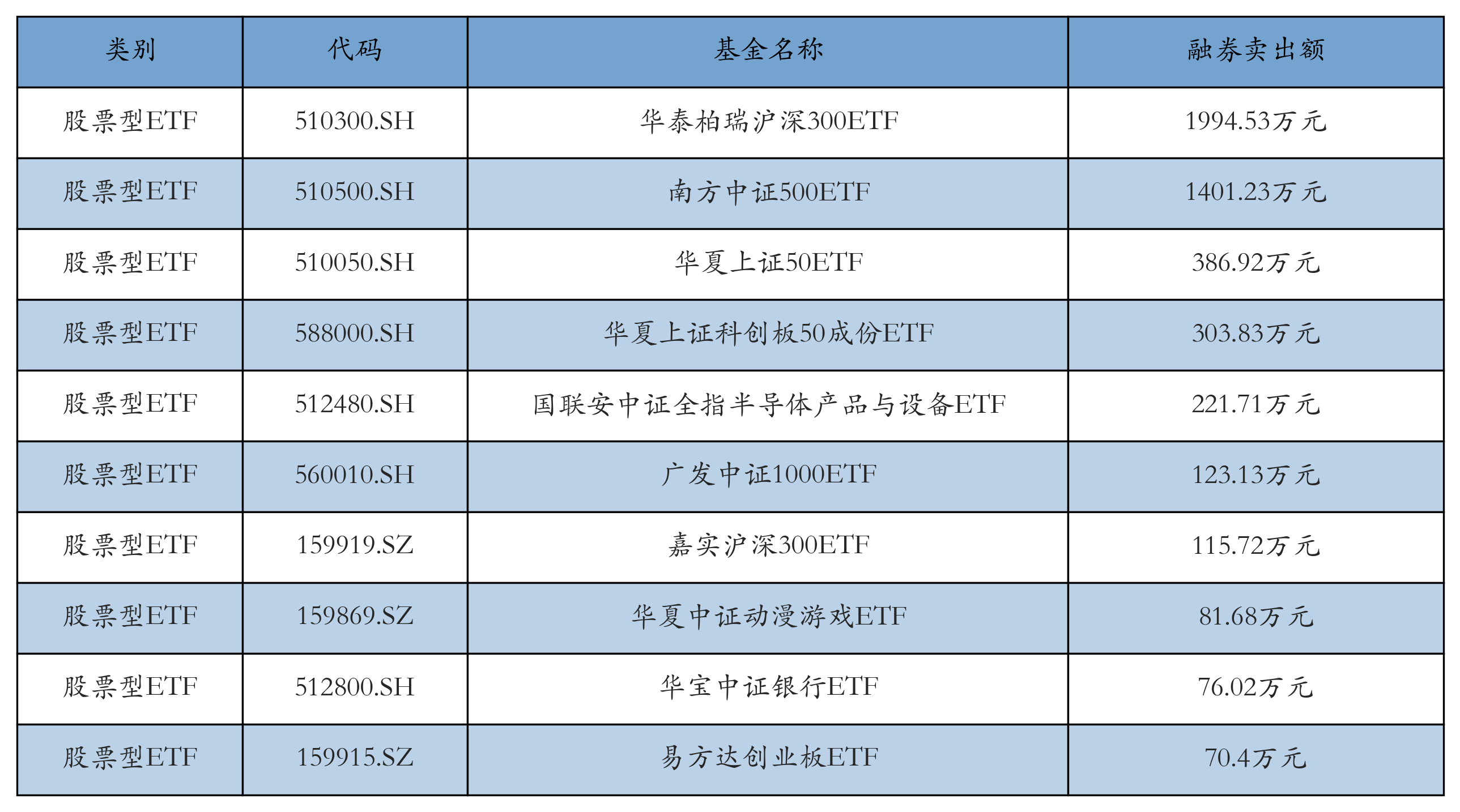昨日股票型ETF融资卖出额最高的3支ETF及其卖出金额分别为:华泰柏瑞沪深300ETF(1994.53万元)、南方中证500ETF(1401.23万元)、华夏上证50ETF(386.92万元)。融券卖出额前10详情见下表: