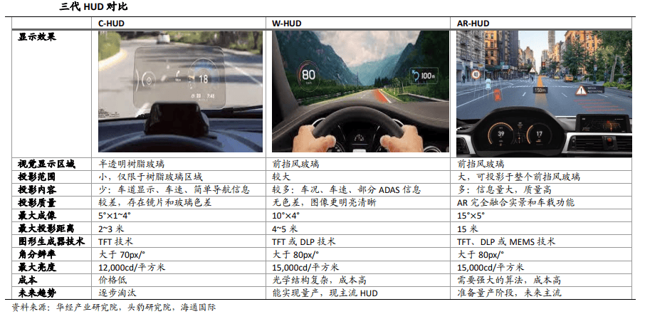 车载HUD解决方案可以分为C-HUD、W-HUD和AR-HUD三类。目前主流的解决方案是W-HUD,影像直接投射到前挡风玻璃上,出现在驾驶员视野前方。