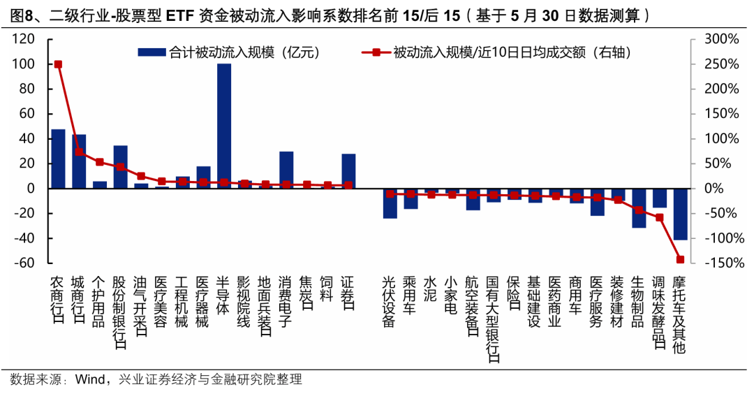 二级行业层面,半导体、农商行、城商行、股份制银行、消费电子等行业被动流入规模居前;摩托车及其他、电池、生物制品、光伏设备、医疗服务等行业被动流出较多。