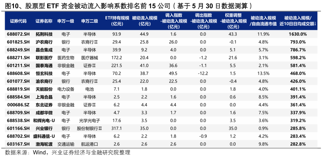 为了探究指数调整对股价表现的影响,我们首先对行业和个股因指数调整带来的股票型ETF资金被动流入/流出规模进行全面测算:
