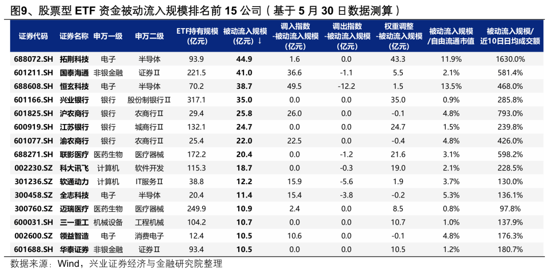 从6月指数调整带来的股票型ETF资金被动调仓规模看,一级行业中,电子、银行、非银金融、机械设备、有色金属被动流入规模居前,而电力设备、汽车、医药生物、食品饮料、基础化工等行业则被动流出较多。