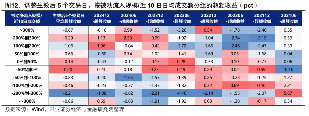 基于前文测算方法,我们分别计算近年来6月和12月指数调整阶段个股的被动流入或流出规模,并以被动流入或流出规模占近10日日均成交额的比重刻画因指数调整带来的股票型ETF调仓对个股所造成的潜在冲击影响。
