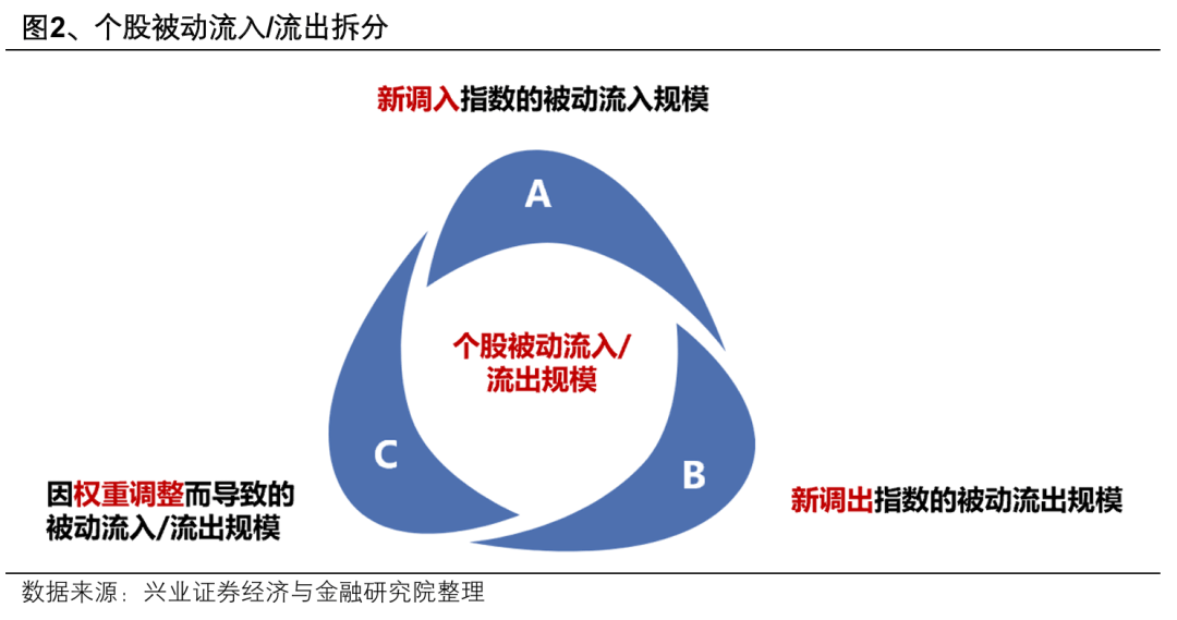 对于同一公司,当其被新调入指数时,有可能同时从其他指数中调出,同时也可能会因所在指数的权重调整而导致跟踪的ETF资金被动流入或流出。因此,在指数调整过后,行业和个股的ETF资金被动流入/流出规模实际上取决于三个方面:1)新调入指数的被动流入规模、2)新调出指数的被动流出规模,以及3)因权重调整而导致的被动流入/流出规模。